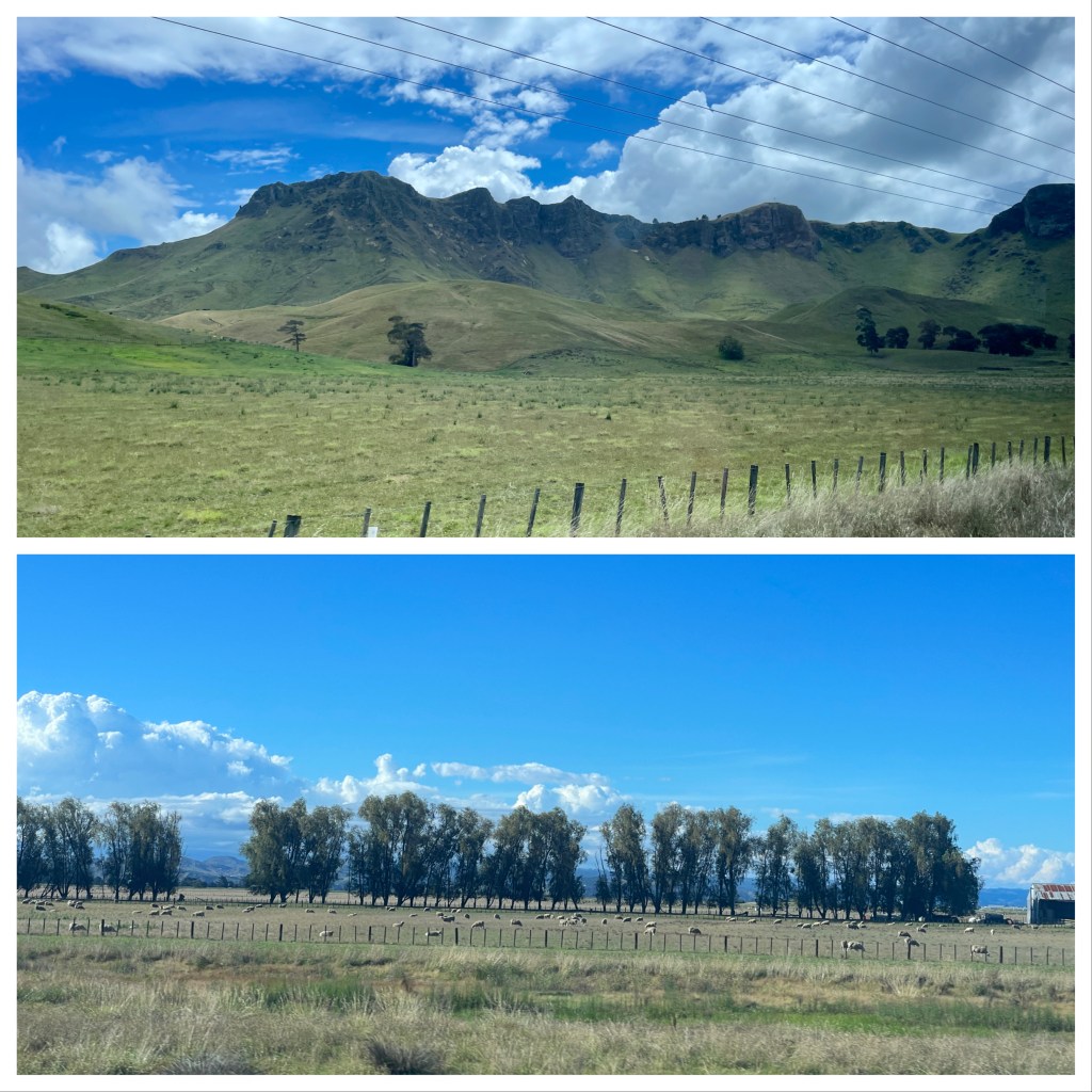 The surroundings are flat fertile lands surrounded by hills. Our driver described it as “one big farm” and a “fruit bowl.” The economy is defined by the production and export of natural resources. It is the largest wool center in the Southern hemisphere. It is the second largest wine region in New Zealand, after Marlborough. It is known for the export of wool, meat, timber and wood pulp as well as apples, pears and stone fruit. The area doesn’t get lots of rain, but 4 rivers feed underground aquifers. By tapping the aquifers to irrigate the fertile land, they have accelerated growing seasons for their crops. California pine, for example requires about 30 years to mature in California; 20 in the Napier area.