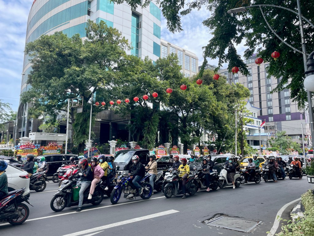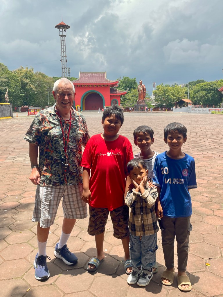 Semarang is the capital and largest city of Central Java. The city has about 1.7 million people, but the greater urban area hosts over 6 million. (The states of Washington and Oregon have 8 million and 4.3 million for comparison.) Think about putting all Oregonians in one place and giving them all motor scooters. Throw in some cars and buses and you have Semarang traffic. It takes lots of time to get places. The road and river system was developed to bring goods to port and isn’t bad, but there are so many (unruly) vehicles. Fortunately, the residents hold down the number of vehicles by placing 3-4 people on a scooter. It’s not surprising to see a family of 4 on a scooter. The parents sometimes have helmets.