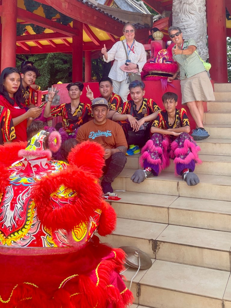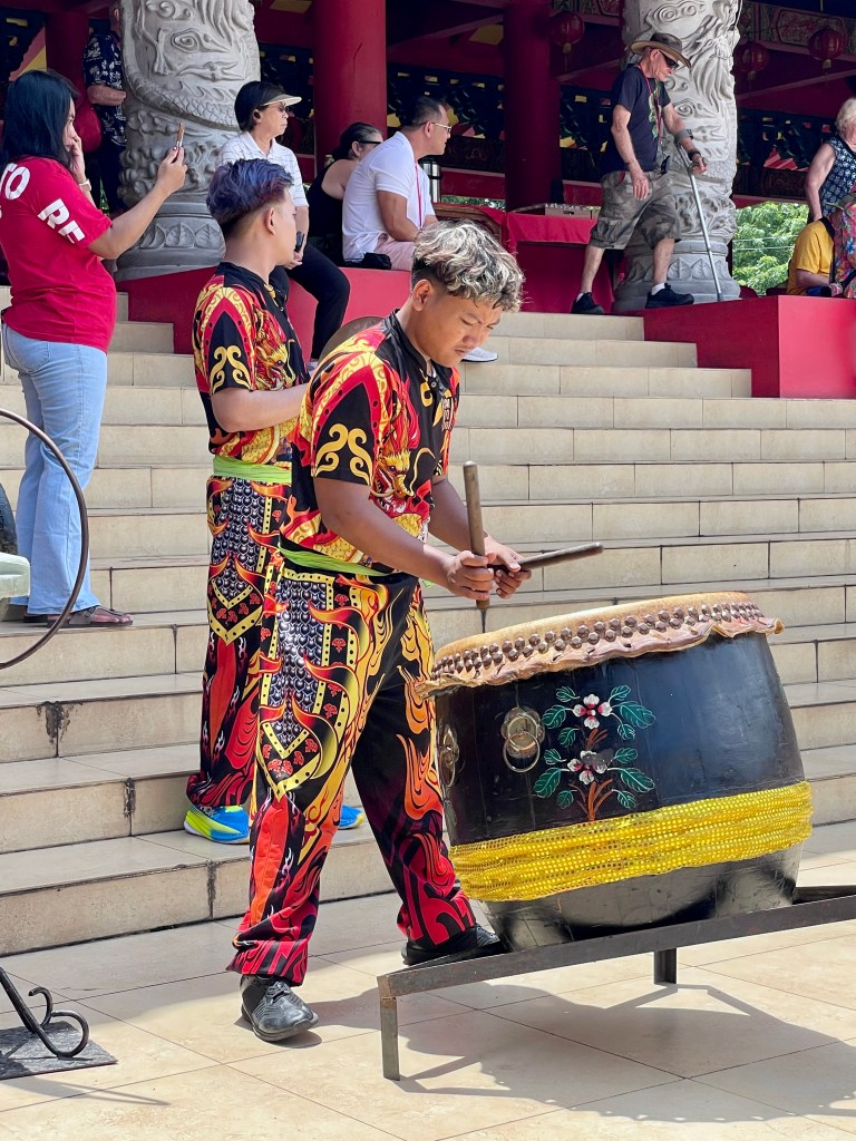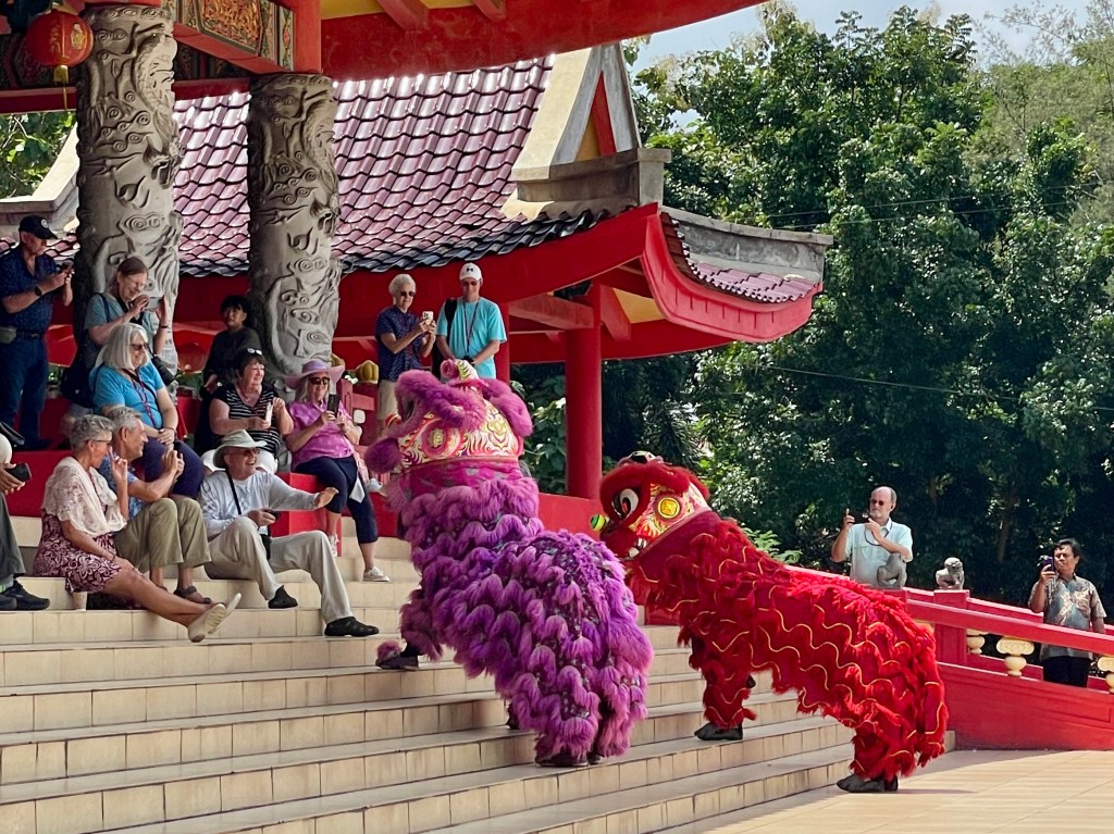 The raw material for the excursion was lacking, but trips are what you make of them. We enjoyed the entertainment by younger kids (teenagers?) dressed in dragon suits and dancing to drum and gong music. They performed with two per suit and seemed to enjoy it even in hot and humid weather Perhaps it was normal to them. Karla had an interesting discussion with a local about “her fortune.” There were several pronouncements about her future. I was relieved to hear that her next pregnancy would go well. When we returned to the ship we visited several booths on the dock and added a nice shirt to my collection.