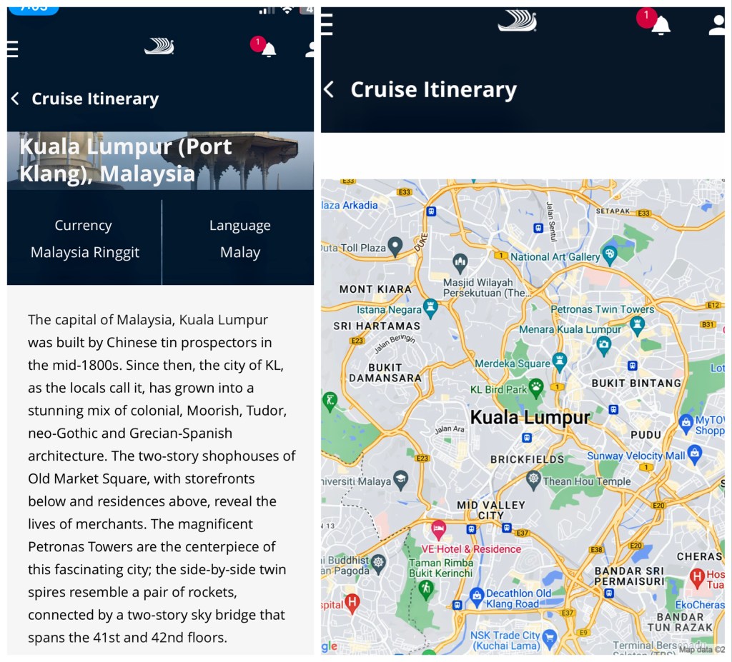 As we head into the port, we listened to the “port talk.” Viking described the city excursion to Kuala Lumpur as 5 1/2 hours with transportation requiring perhaps 1 1/2 hours both ways (only a 61 km distance so really bad traffic). We took this tour on our first visit and it was nothing special….a museum, some buildings, and it seems like something more. Our memories could be dampened by the downpour we experienced in KL. Evidently, there is also a shuttle bus to a closer destination, Port Klang. I think there’s a mall there. So, I googled it and found some valuable information.