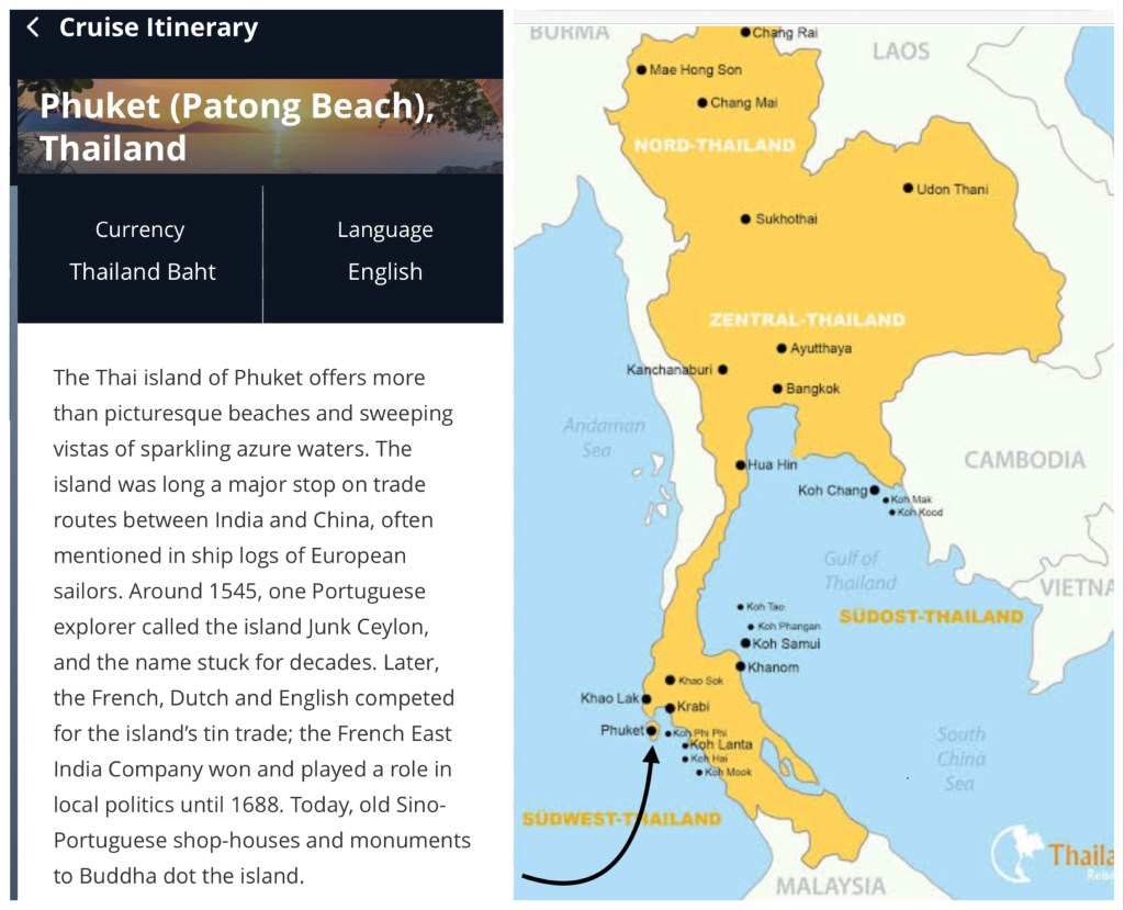 Phuket is Thailand’s largest island and 2nd smallest province. It is our only stop in Thailand….which is OK. We like Thailand, but favor the northern part of the country. Our last ship-stop was at a port with access to Bangkok, but it required a 2 hour bus trip both ways. Then, the city was so crowded that it was difficult to do much. Our stop this time found us in Patong Harbor. While we had stopped here before and enjoyed our massages, I thought I’d check the web to get some commentary. I found a number of comments: