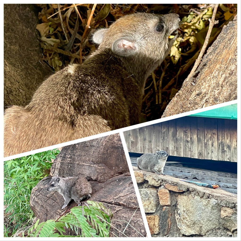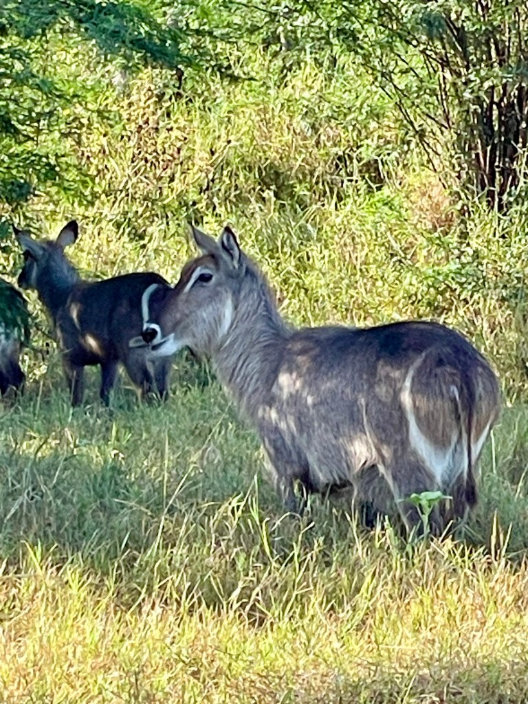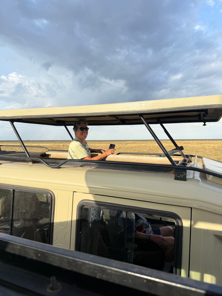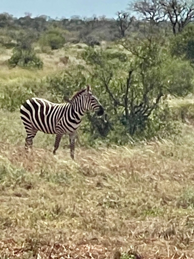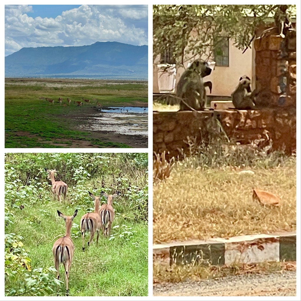 Our safari, with only Karla and I as passengers, was led by a driver/guide (Alex) and spotter (James). We had about 3 hours looking for animals on the way to the lodge, then 2-3 hours in the late afternoon and 4 hours the next morning. At first, there was some excitement when we spotted and stopped to watch an elephant 50 yards away. By the end, it was “just more elephants” and we would keep driving. We saw herds of elephants and Cape Buffaloes, lots of gazelles and impalas and similar creatures, giraffes, and hippos, mostly submerged. There were 25-30 different kinds of birds, all of which our guide identified. Our hotel room had a sign advising us to close the window at night to avoid visiting baboons; they were there too.