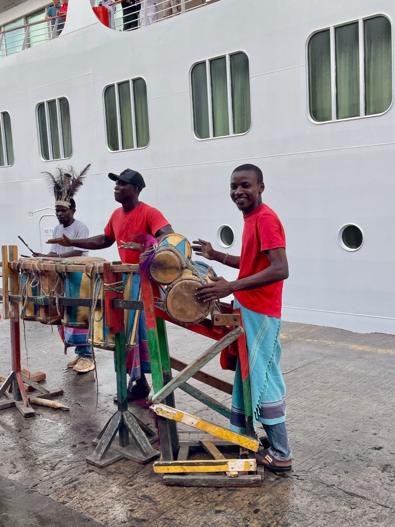 -We enjoyed the markets. I bargained aggressively and we bought perhaps 40 small soapstone carved animals. We’re giving them away to crew members who have been giving us such great service. I think the merchants know that we tourists are told to only offer half of what the merchant asks. Consequently, they might offer a carving for $5 when they would settle for $1. So many passengers would offer $2.50 and bargain from there. On one of our last deals, the merchant was interested in my ballpoint pen. ..for his kid, he said. To get it, he offered 2 carved animals for my pen and $20. I countered at $2 and the pen. He was dumbfounded., looking for a new floor of something like $10. I ended up paying $3. After a long bargaining session, one merchant asked if I were a policeman. I think that was a compliment.
