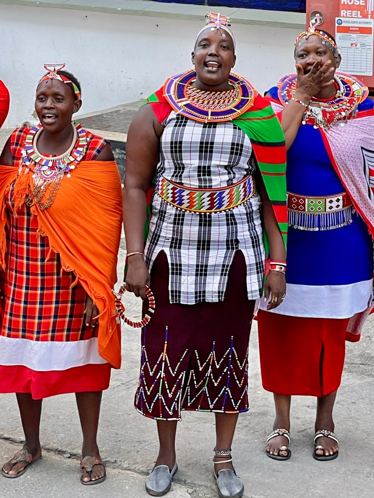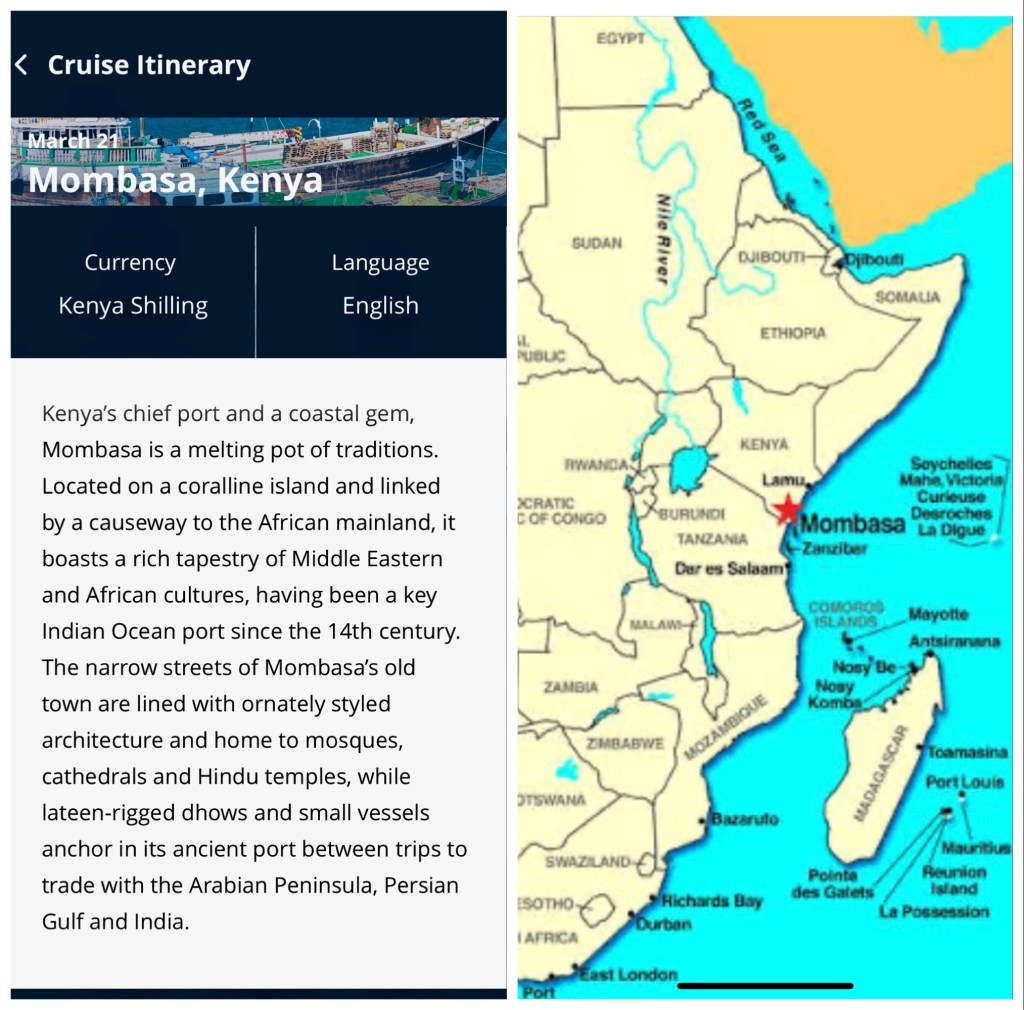 -There are lots of people living very close to the margin. Kenya is among the poorest countries in the world. We stand out as white in a sea of black. The ship’s port talk warned us all of potential crime and risks of walking alone in Mombasa. There is some logic to going after Americans who may be carrying about 6 months income, but we didn’t experience any problems. People were very pleasant and smiled a lot.