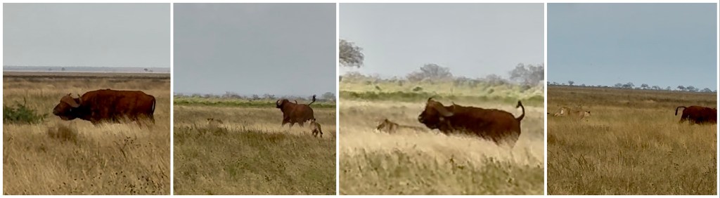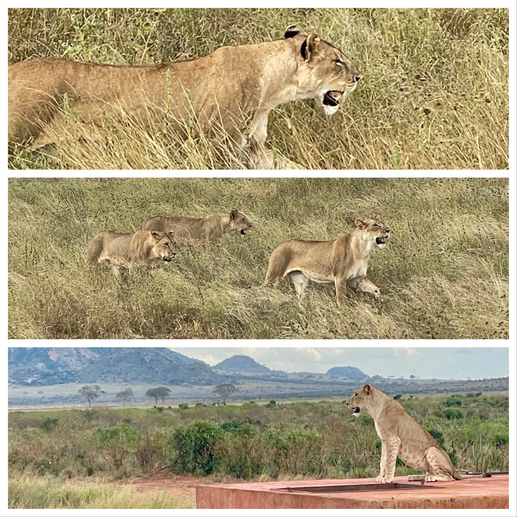Our number one experience was encountering 5 lionesses. Frequently, lions are not seen. There were 5-6 safari vehicles parked and watching the lions. Our driver saw that the lions were looking off in the distance. He saw a water buffalo, perhaps 200 yards away. He told us that we should drive farther up the road toward the water buffalo; he thought the lions were going to attack. He was right and we were well situated. The lions stealthily moved through the grass and closed the distance. At the right time, the lead lion charged at the water buffalo which took off running. I thought the lead lion would catch it and then the others would help bring it down. But the lion came up about a yard short before the water buffalo escaped. (The photos below don’t do it justice). The lion then looked like the cat that missed a bird. It had a look like, “I wasn’t really trying.” Our guide explained that, judging by the spots, the lions were only about 3 years old. They were just learning. I’m not sure how the water buffalo tells it. Lions are usually sleeping, not performing. Our guide said that it was very rare to experience.