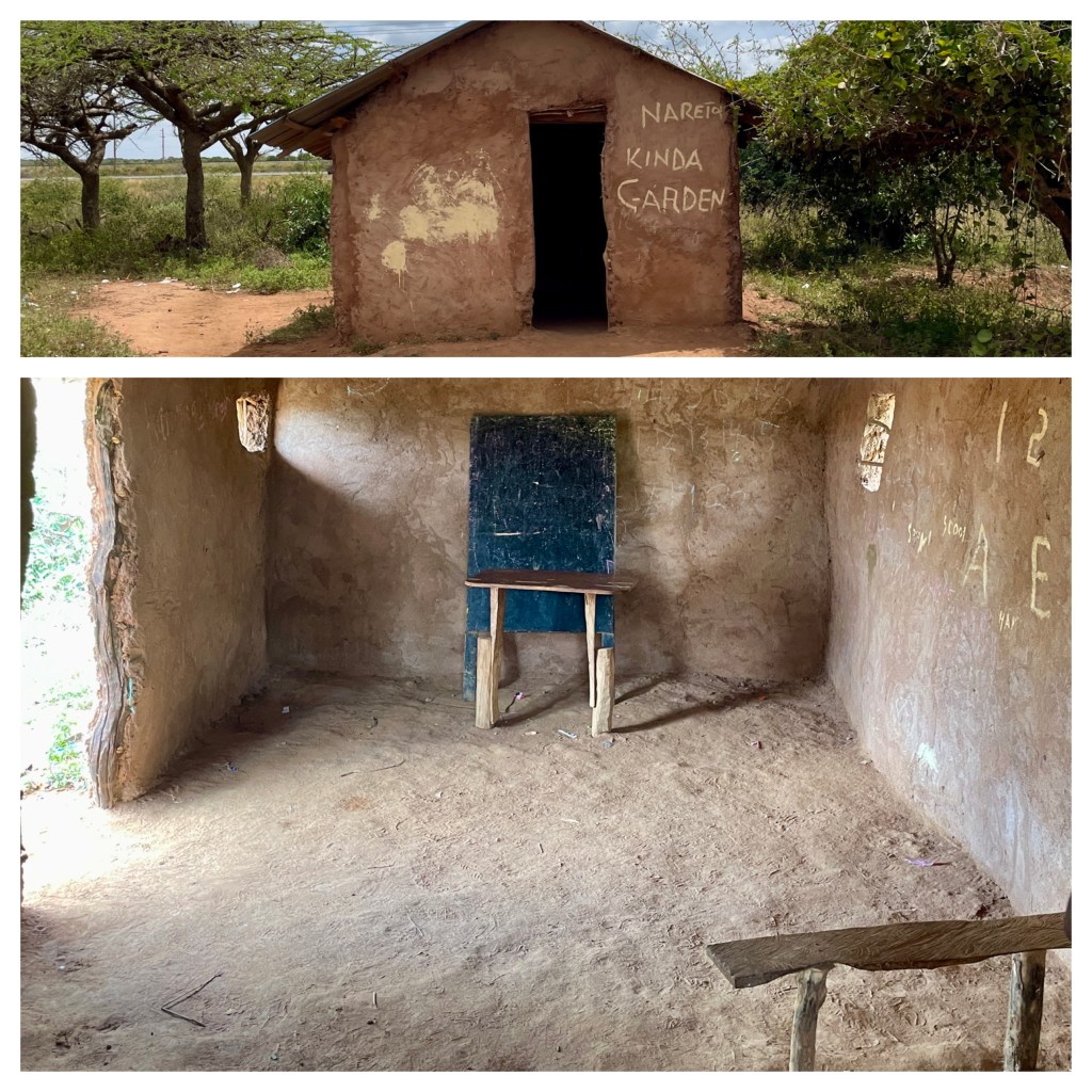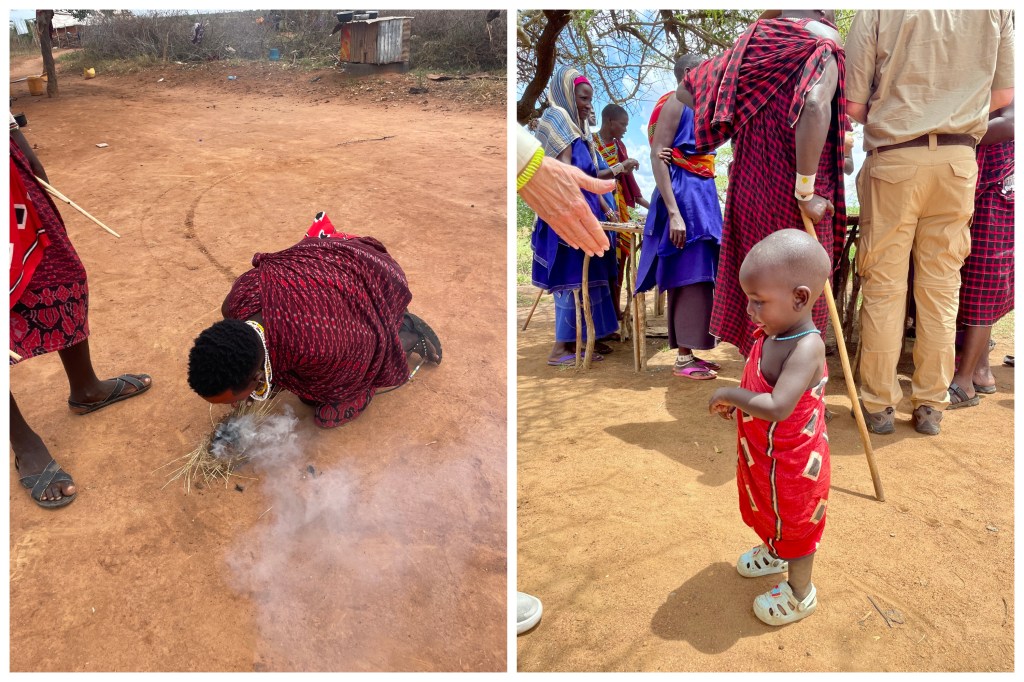 They showed us around, started a fire by rubbing sticks together, and then catching the sparks in a mixture of elephant dung and grasses. They also performed a tribal dance. The teacher showed us their school house which was a rickety building with dirt floors, some wooden bench seating, and a badly scratched blackboard. The teacher spelled his name for us in the dirt with a stick and asked Karla to spell hers and mine. The village school educates kids under 8, after 8 they go to a state school. Our guide noted that the government had gotten after the Maasai for not sending their kids to school.