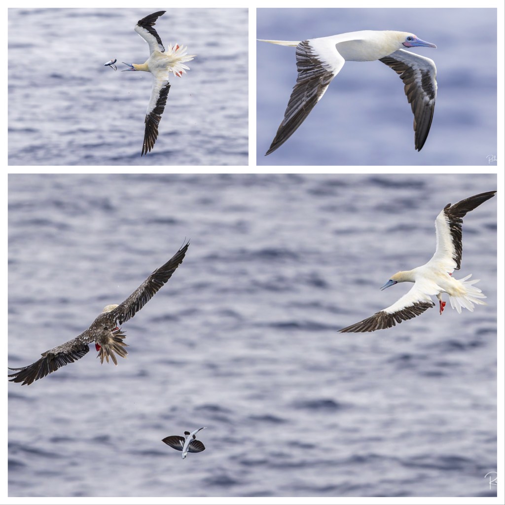 Our favorite lecturer on ship is a wildlife biologist. He holds court in the morning just to talk about wildlife sightings the previous day. We haven’t seen much but he’s entertaining. He “guarantees” us whales as we round South Africa and again as we near England. He has a camera that takes 30 photos per second and gets some good shots. He spends most of his free time deleting. Our major wildlife attraction is red footed boobies circling the front of the ship and then diving for flying fish. The boobies swallow the fish head first to avoid problems with fins and swallow rapidly to keep another booby from stealing their prey. Some of his photos are below.