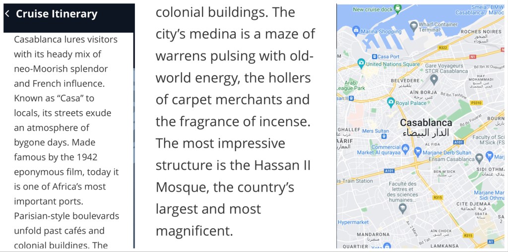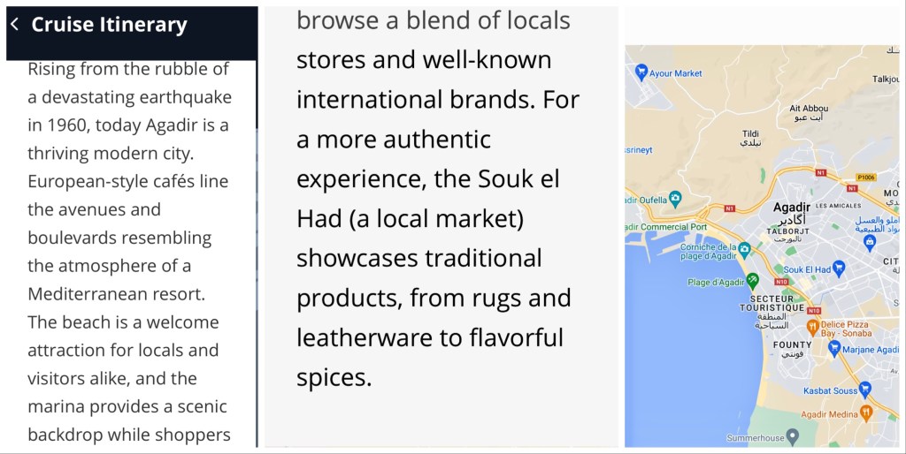 We’ve visited Morocco 3-4 times, including with Maddy and Jackson when we lived in Spain. We especially enjoy Marrakech, but will only visit Agadir and Casablanca on this trip. Several hundred passengers will be taking the 4 hour bus ride from Agadir, our first stop, to Marrakech. We’re not excited about 4 hours on the bus; plus, it would get in the way of Karla’s hammam visit. I support that; I want to see her cleaned up and relaxed.