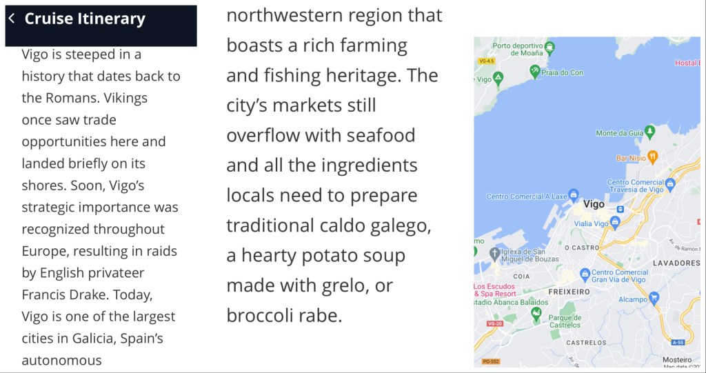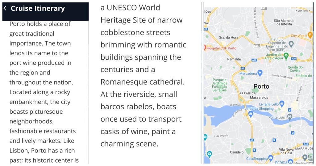 Having skipped Portimao, it appears that we’ll have more time in Oporto. That’s good because we like it there. We’ve had 2-3 previous visits and enjoyed a Viking river trip on the Douro River. Someone else apparently discovered it before us. It was declared a UNESCO World Heritage site in 1996 and in the past 10 years has been chosen Best European Destination, City of the Year, and Leading Seaside Metropolitan Destination. The city has about 250,000 people, but the urban area has close to 1.5 million people. Interestingly, a number of older houses are at risk of collapsing and about 100,000 citizens have moved to the suburbs since 1980. There has been some history of collapses; in 1806, thousands of citizens fled a French invasion and 4000 died when the bridge collapsed under the weight.