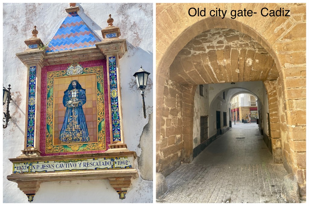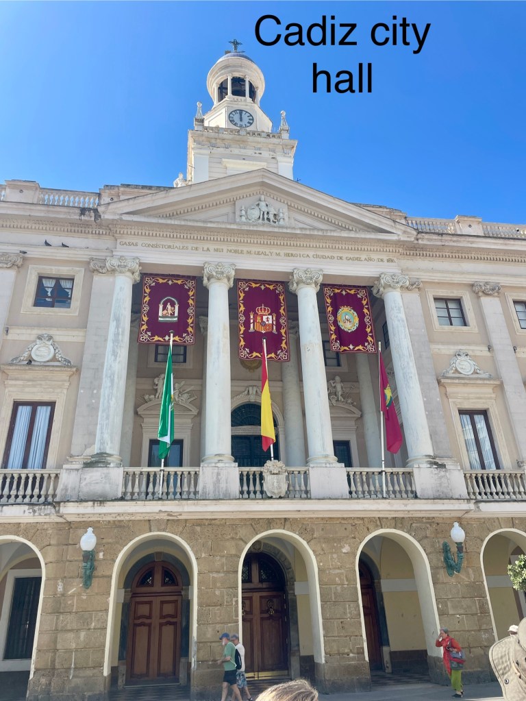 Kids waiting at the finish; Karla is in the apricot color shirt with cap. Cadiz is a well-located city on a peninsula in the Atlantic. Today, it is the capital of the province of Cadiz in the Autonomous Community of Andalusia. There are about 120,000 residents although the population is on the decline. There is no room to expand and the relatively high unemployment results in younger people leaving for better opportunities. Its location has led to a long history as a trading port. Following the earliest settlers in 1100 BCE, Cadiz has been occupied by predictable powers…Phoenicians, Carthaginians, Romans, Visigoths, and then the Moors from 711 to 1262. As the “Voyages of Discovery” began, it played a key role as a supply and trading port. In fact, Columbus began his 2nd and 4th voyages from Cadiz. Later, it became home for the “Spanish treasure fleet” and a target for Barbary pirates as well as Sir Francis Drake. Drake occupied the port for 3 days, captured 6 ships and destroyed 31 others. When the locals wouldn’t pay a demanded ransom, he had the city burned. There are still lots of old buildings, many of which have been cleaned or restored.