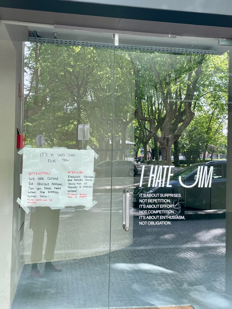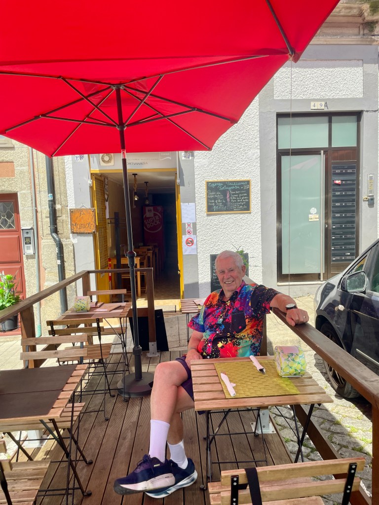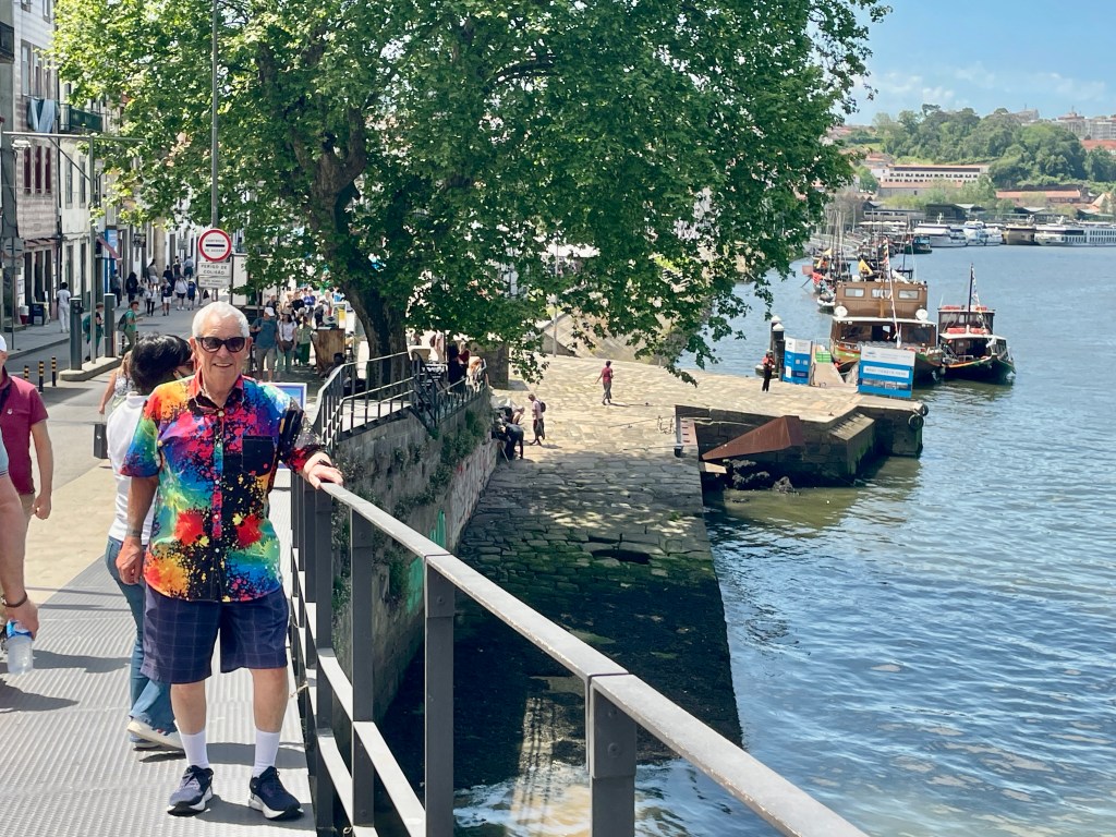 We arrived the day after a nationwide power outage that affected both Portugal and Spain. This was posted at a local gym, cleverly called “I hate Jim.” A ship shuttle bus took us to a drop off point in Oporto around 11. We stopped at a small, “hidden” restaurant for a salted cod (baccalau) lunch, which was very good. Then a mile walk took us through winding streets and then the active riverfront area. It’s loaded with colorful shops, street stalls, street performers and restaurants. We crossed a bridge to find more of the same before arriving at our tour starting spot an hour early. That gave me a chance to get a nap on an unoccupied spot on a lawn. As I woke up, I was not bothered by overflying birds and dogs walking by, even though the grass had various shades of discoloration.