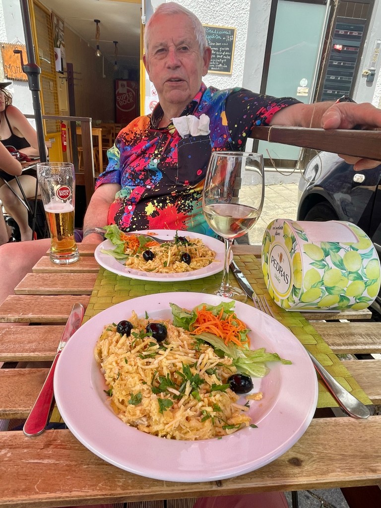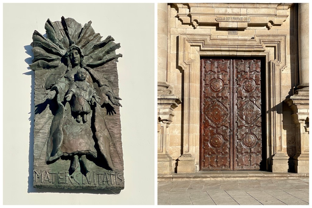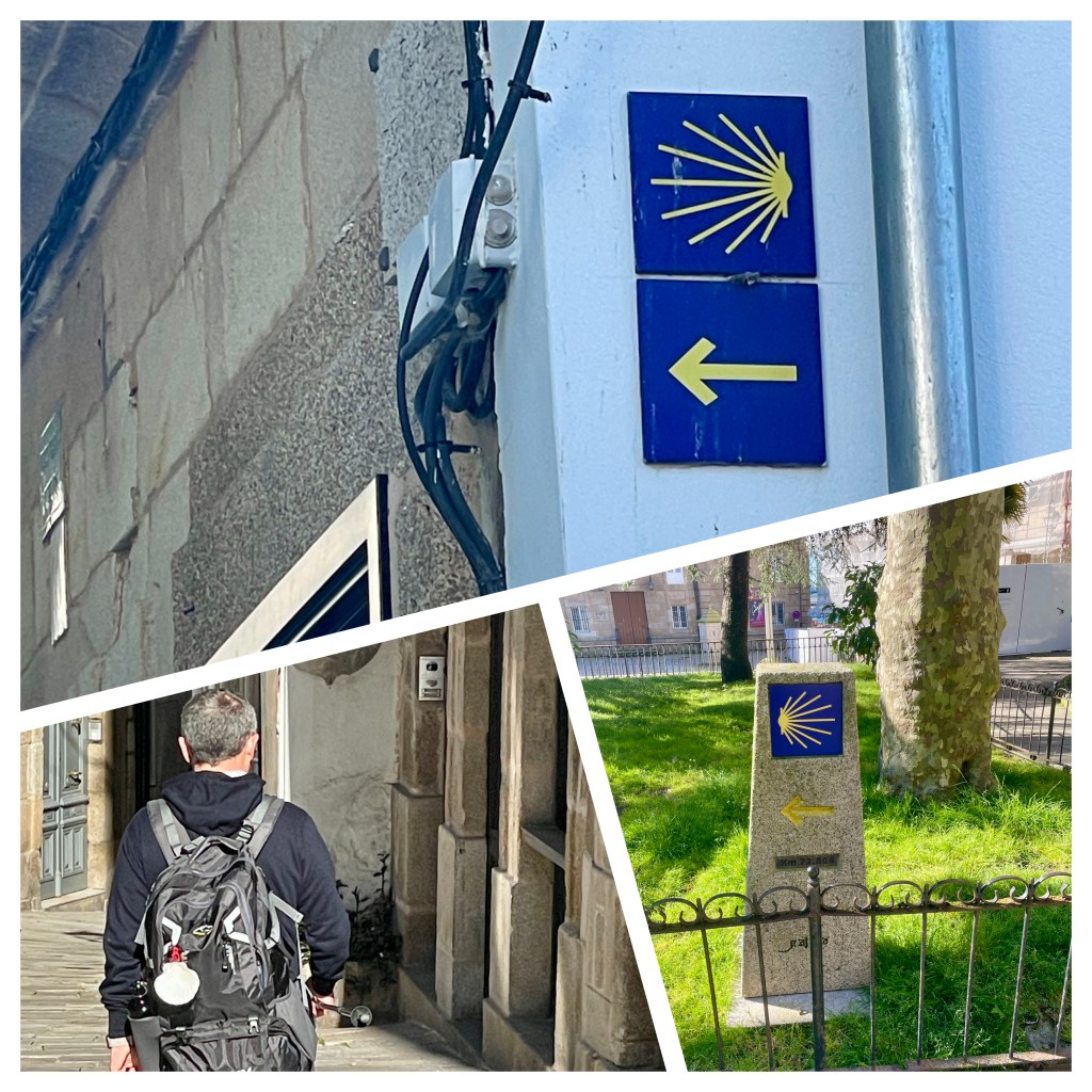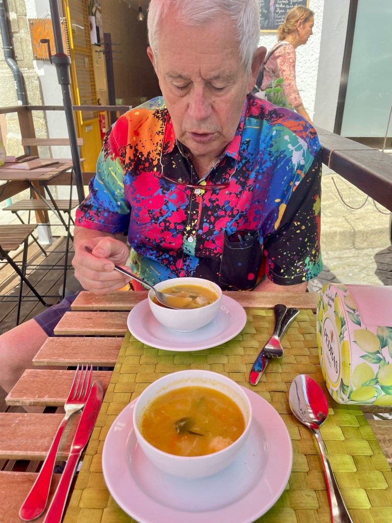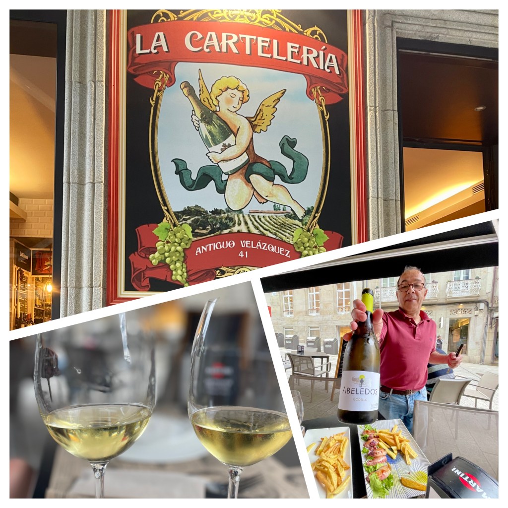 Camino milepost and signage. Upon Karla’s return, we decided to visit a small cafe/tavern off the beaten track. We chose one and ordered the local beer and wine to go with our octopus and squid…as well as a local cheese. They were all good. If we were to do another world cruise…which we don’t plan to do…we would do lots more small cafe eating. Our tendency to eat on the ship (where everything is paid for), has kept us from sampling local food and culture.