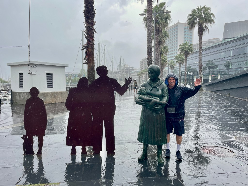Drenched. Port statue commemorating emigrants who left Vigo for the Americas. -