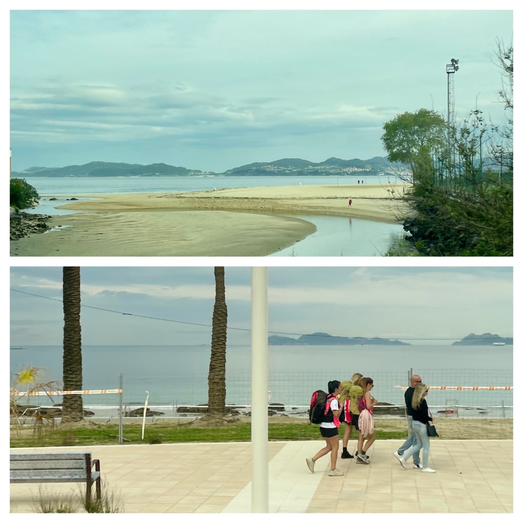 Playa Samil and Camino pilgrims on their way to Santiago.