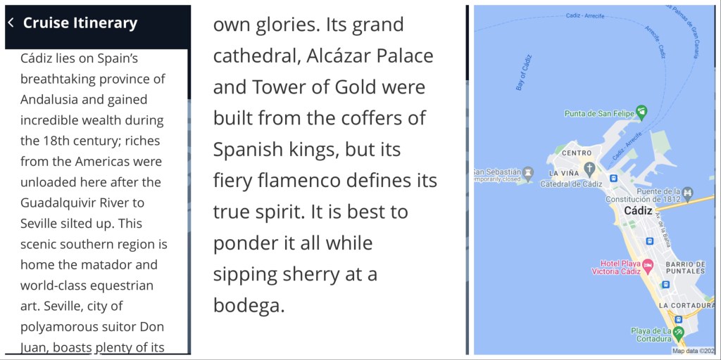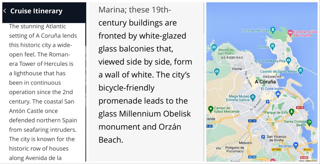 This morning, when we got up, I checked the wind speed….about 20mph. I said to Karla that there could be a problem anchoring and riding the tender into port. The captain, perhaps having overheard me, announced that we would be skipping Portimao…the wind speeds are projected to pick up. At these speeds, the tender moves up and down…perhaps 3 feet. We have no trouble timing our steps, but lots of passengers do. It’s scary watching someone with a cane or walker negotiate the step. I’m sure that Viking worries about injuries…and liability. Of all ports, this seems like a good one to skip. The captain is seeing if we can dock at Porto earlier.