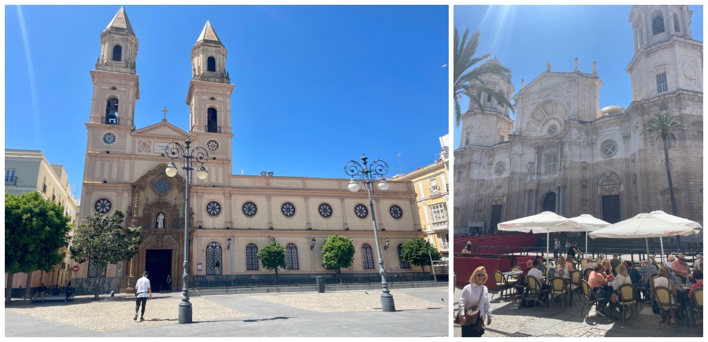 Left: plaza de San Antonio; right: cathedral and the square where we first had fish and chips many years ago and the kids ran around.