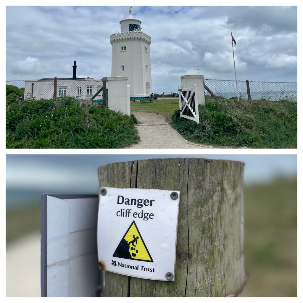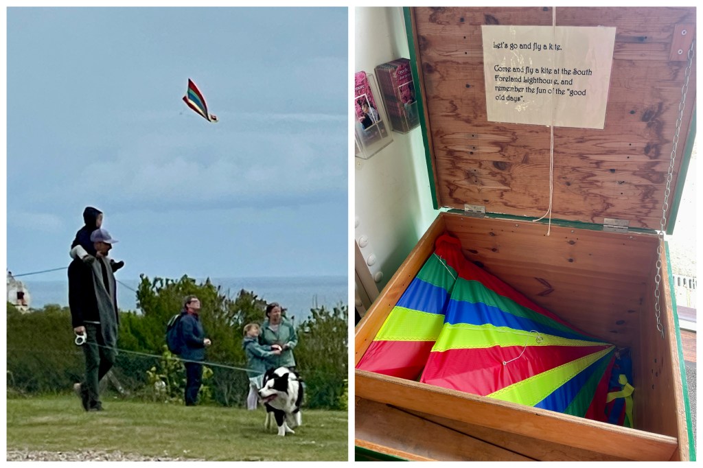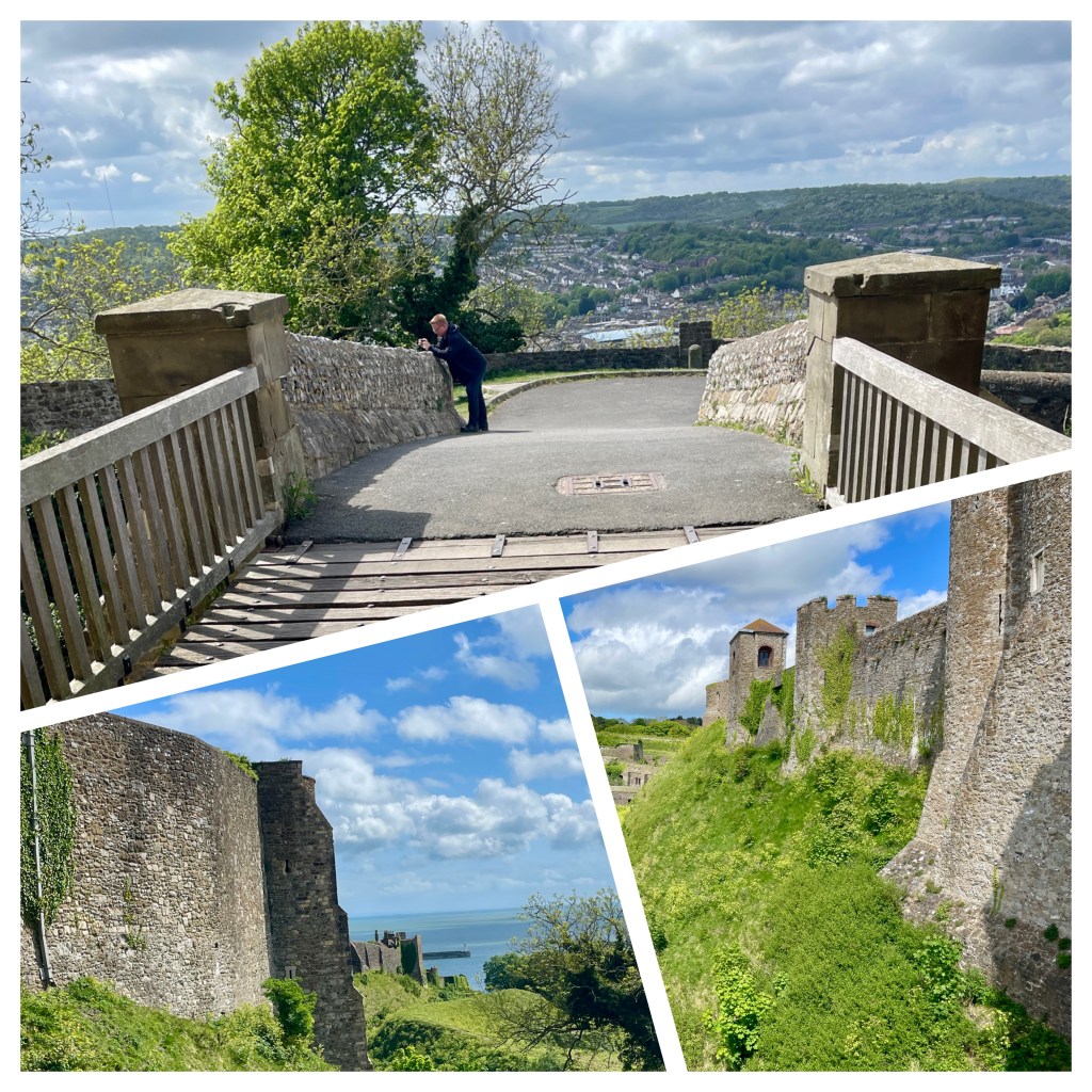 Always windy, a great place to fly a kite and loaners available in the gift shop. Karla walked the white cliffs to a lighthouse last time we were here. She decided to do so again and I tagged along….for the first 10,000 steps. I returned to town and looked around until the shuttle bus arrived. Karla hiked to the castle after touching the lighthouse.