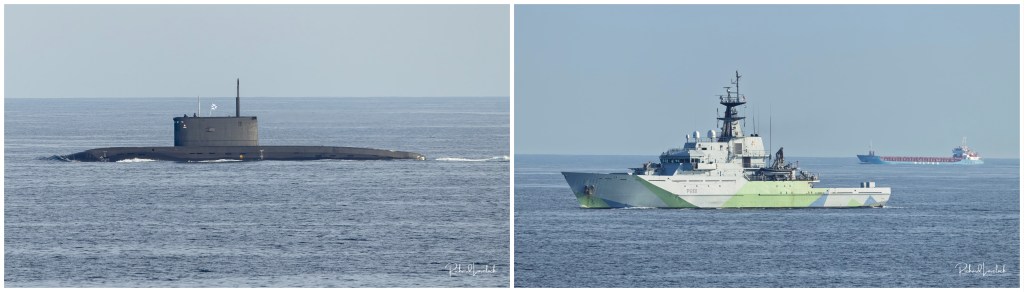 Offshore a Russian submarine, followed by a French Navy ship.