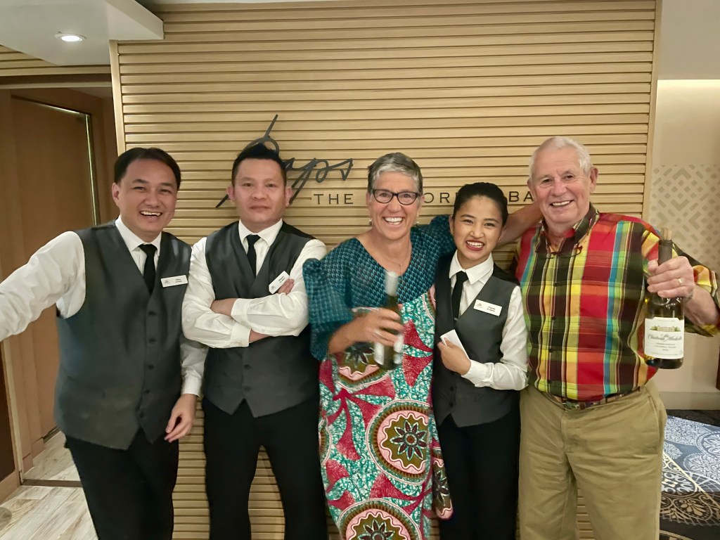 8. The Crew. Perhaps the high point is the crew. So many nice people who serve us well. As we get to know them, we are even more impressed. Last cruise, we asked one talented wine steward what she wanted to do later in life, she responded, ‘President of Botswana” and she was serious. The labor markets have moved many talented people to Viking as a step toward future growth. We benefit from their being here and count many as our friends.
