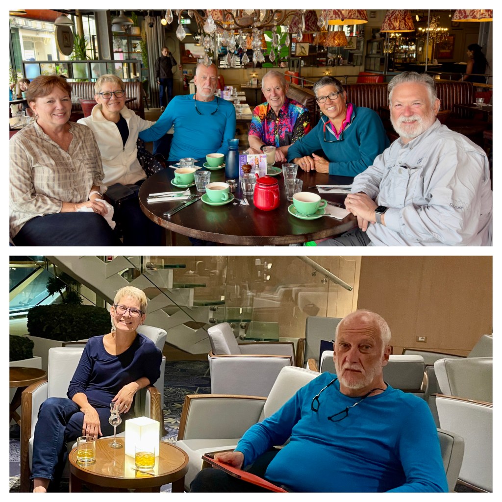 Viking crew enthusiastically greeting us back to the ship; below, our friends’ group and favorite lounge, -
