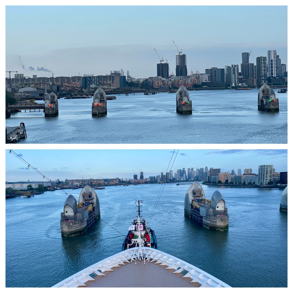 Entering the Thames River and the lane controls On our last evening before docking at Greenwich, we had a great dinner with our best friends group honoring JoAnna’s birthday….which would take place several days later. One might think it was so she could be sure to get presents. But, she and Mary brought a bottle of 1975 Port so that speculation doesn’t work. Two of our favorite crew members, Grace and Damian, were the servers so it made the evening special.