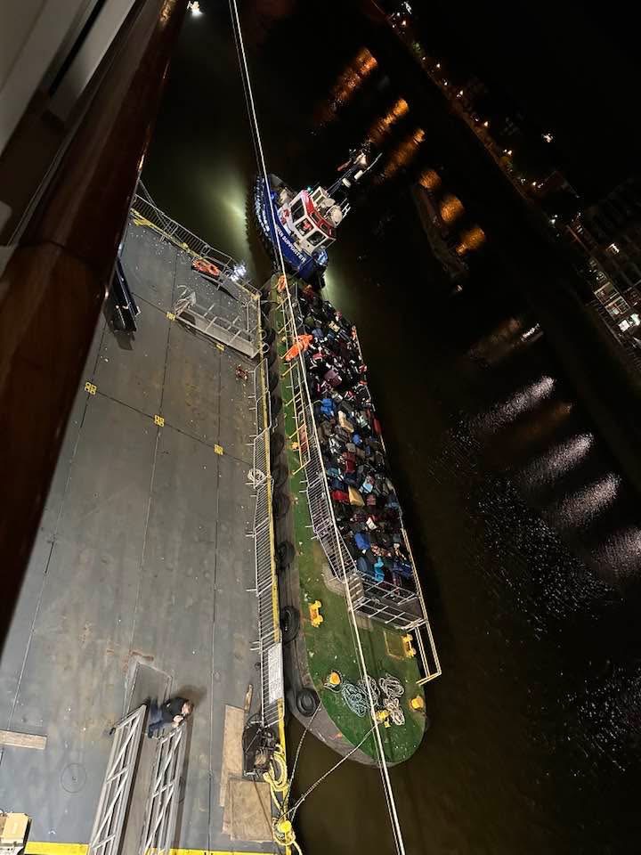 Greenwich is a tender port, so our luggage had to be transported to shore for the bus trips to the airport. This is a photo of the loaded barge.