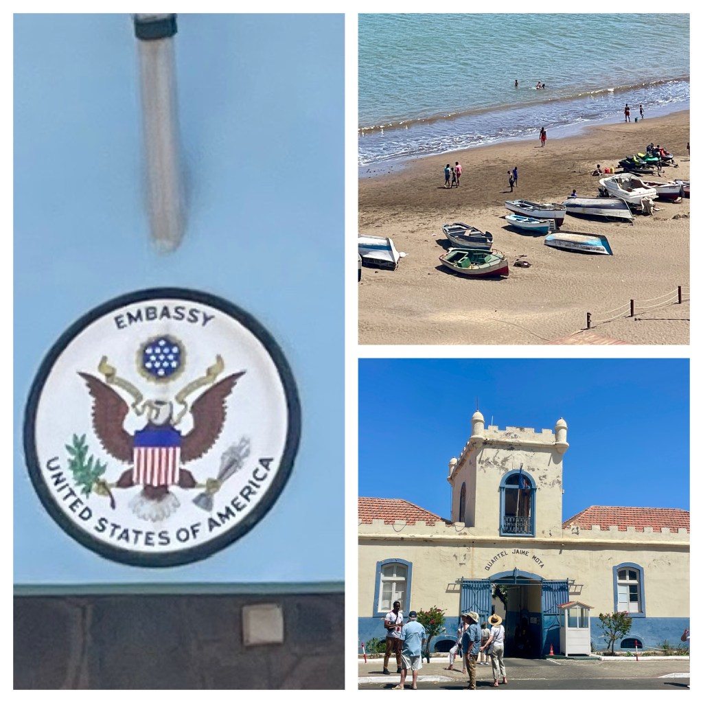 Praia, with about 150,000 people has about 56 percent of the Cape Verde population. The economy is driven by agriculture, public administration, health care, education and tourism. While 90 percent of their food is imported, Cape Verde exports bananas, coffee and, sugar cane. Tourism represents 37 percent of the economy. Interestingly, the strategic location is also popular with cocaine traffickers as they move their product to the Americas and around Africa. There is double-digit unemployment and informal housing…here called favelas. There is very limited fresh water which limits economic and population growth. Climate change and related droughts are challenges for the future. Fortunately for Praia, the Chinese are there to help. They are constructing a desalination plant, a sports stadium, a university, and a parliament building.