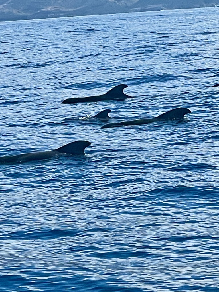 -The whales we have not yet seen could be traveling in pods, gams, herds or schools. Dolphins, which we have seen, were grouped in pods.