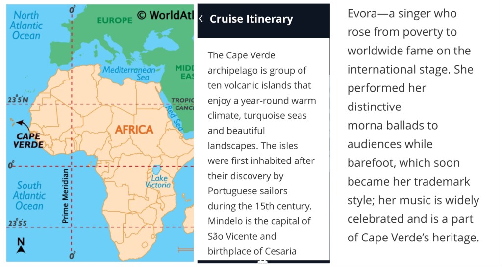 Macaronesia is a collection of islands about 350-400 miles off the coast of West Africa which are part of the mid-Atlantic range. The islands include the Azores, Canary Islands, Madeira, and Cape Verde. We will be visiting Praia, on the island of Santiago, and Mendolo on Sao Vicente Island….both part of Cape Verde. Then, after 2 sea days, we visit Tenerife of the Canary Islands.